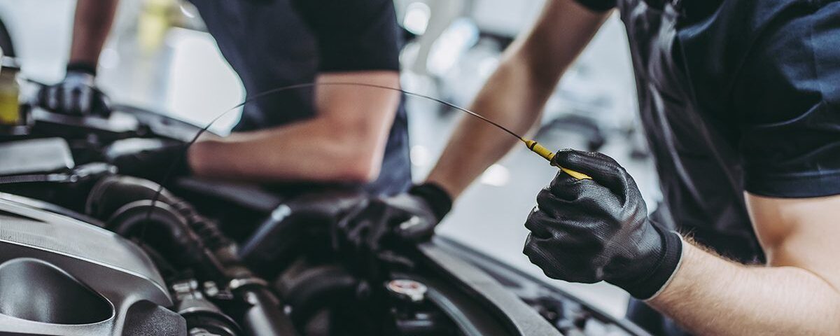 Cropped image of two handsome mechanics in uniform are working in auto service. Car repair and maintenance. Checking the oil level.